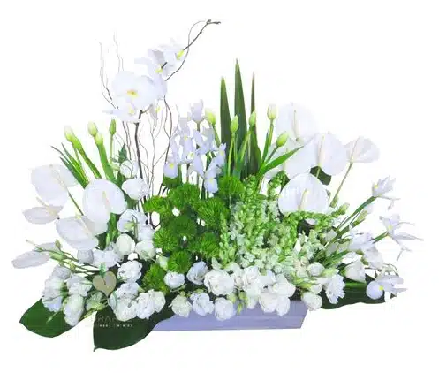 Honra el haberle conocido en esta vida con hermosas flores en su despedida. Envía tu pésame con estas arreglo de flores fúnebres elaborado con 1 decena de Tulipanes, 1 decena de Anturios, 1 decena de flores de Green, 1 decena de tallos de Dragonarias, 1 decena de tallos de flores de Lisianthus, 1 decena de Iris Casablanca y un bello tallo de Orquídea Phanelopsis con más de 6 flores abiertas más botones, con follajes de Fornio y Anturio en una jardinera blanco y gris.
