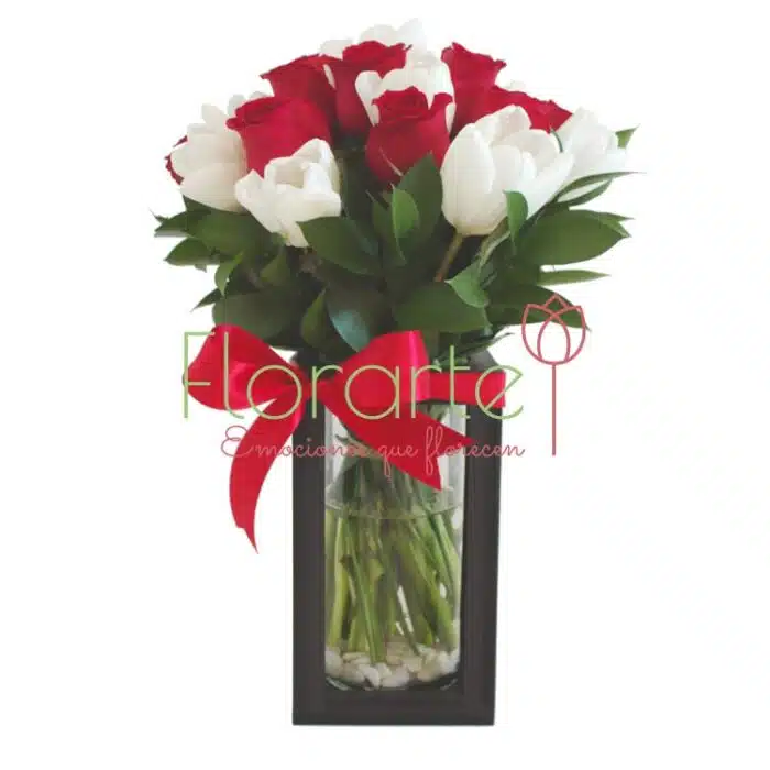 Más que sólo Flores a Domicilio, un hermoso diseño floral en nuestra base babel (vidrio en pedestal) con una decena de Tulipanes blancos y una docena de Rosas rojas, entre follaje de Ruscus.