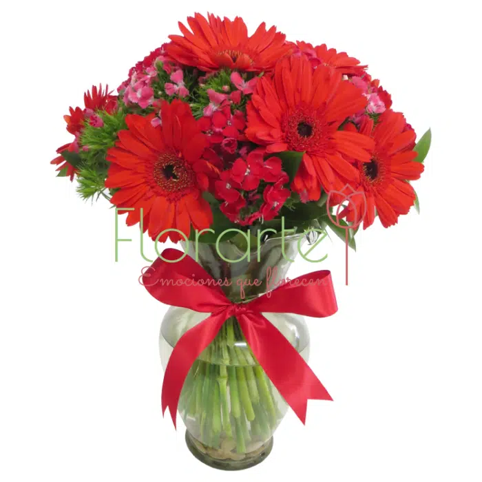 Un detalle que enamora. Una decena de Gerberas rojas entre flores de Dianthus rosados, en un florero de vidrio con atado de listón rojo al cuello.