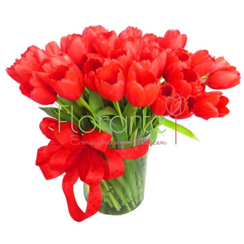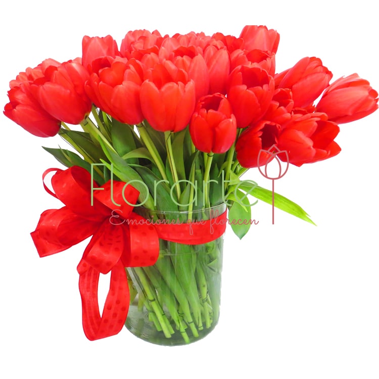 Un arreglo precioso para recordar ¡CINCUENTA PRECIOSOS TULIPANES! En tono rojo (puedes elegir otro tono, pregunta por los disponibles) en un florero de vidrio cilindrico, con elegante moño de satín rojo.