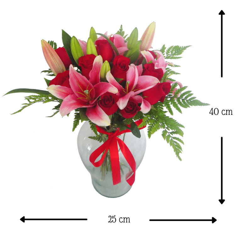 Tus flores a domicilio el mismo día. Una docena de hermosas Rosas rojas entre flores de Lili Oriental Acapulco (5 tallos) entre follaje Leader.