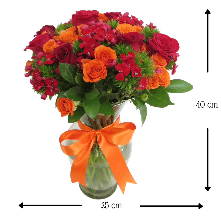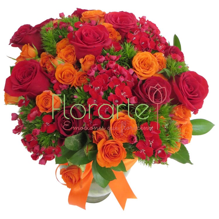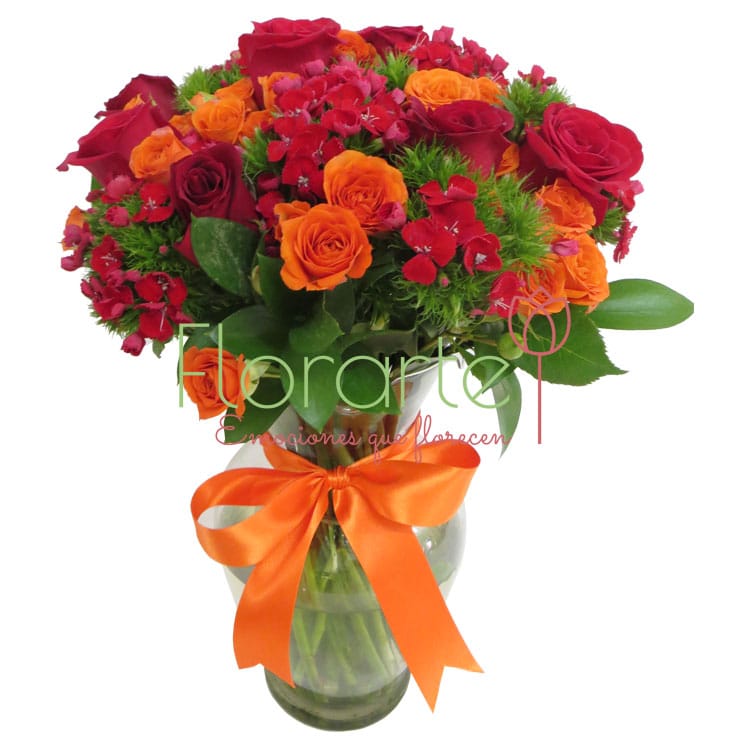 Bella combinación de flores, una decena de tallos de Rosas baby tono naranja, una decena de tallos de Dianthus rojos, una docena de Rosas rojas, follaje de Ruscus, en un jarrón de vidrio con atado de listón de tela naranja al cuello del florero.