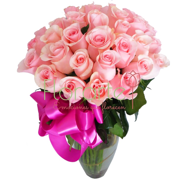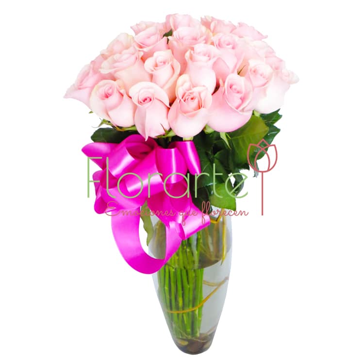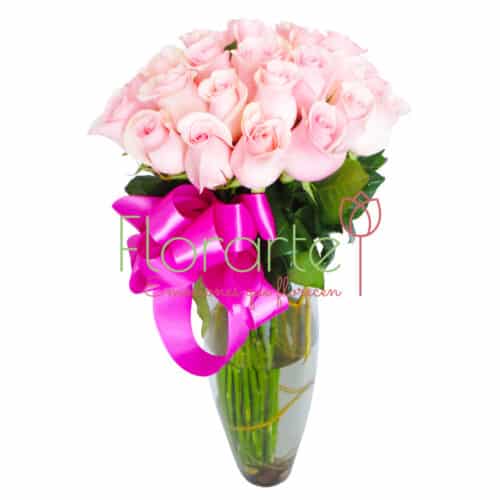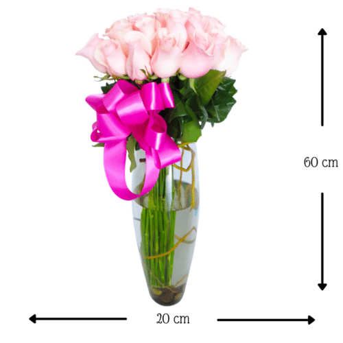 Este arreglo de nuestra línea es una suave caricia para el alma, tres docenas de Rosas en un tono rosado suave, en nuestro florero de vidrio alta fondeado con Curli Willow y piedras pulidas.