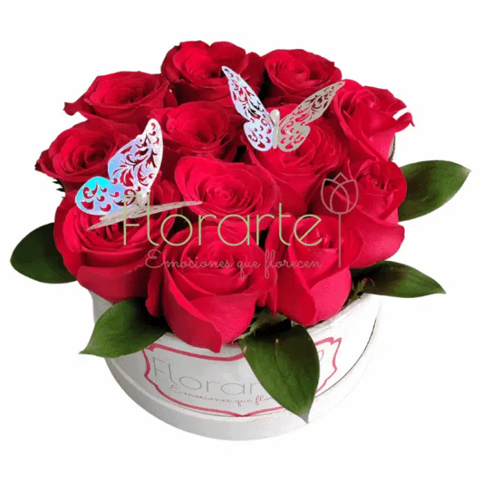 Expresa tu amor con distinción y elegancia en este San Valentín regalando este arreglo floral único. La docena de Rosas rojas de invernadero, con su belleza y fragancia inigualables, se realza con la presencia de dos mariposas que simbolizan la transformación y la libertad. La caja de MDF blanca añade un toque de modernidad y sofisticación. ¡Ordena ya, este regalo que perdura en su corazón!