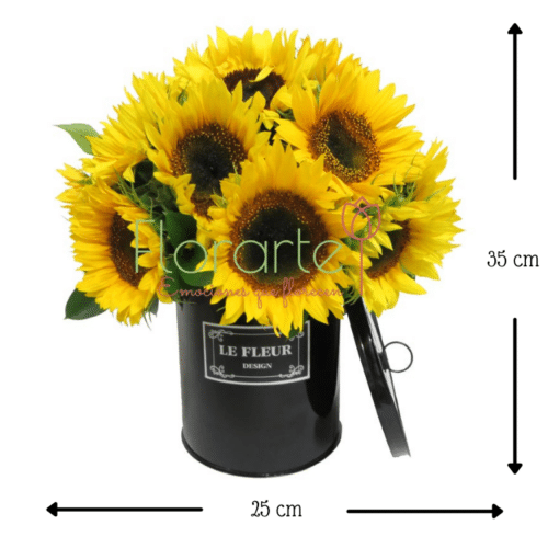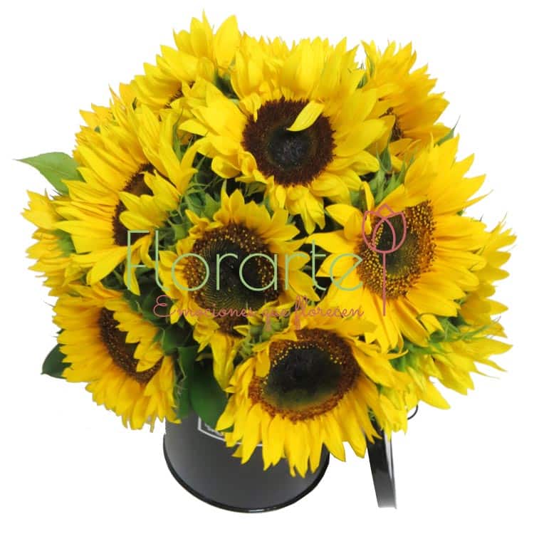 ¡Regala Flores que sorprendan! Envía dos decenas de bellas Flores de Girasol, resplandecientes como la sonrisa que brotará de su rostro al recibirlos en una caja cilíndrica calidad metálica, con agarradera de listón satinado.