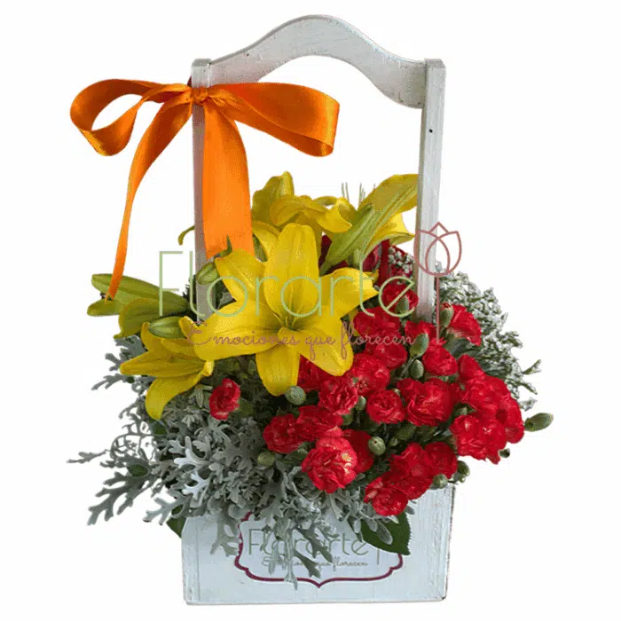 Siempre es una buena ocasión para obsequiarle un bello detalle a tu persona especial. Envía flores hermosas con nuestra canasta de madera blanca estilo vintage elaborada con 3 tallos de Lilis amarillas, Clavellina roja, Statis blanco o Flor de Velo con follaje de Miller con un moño en tono naranja.