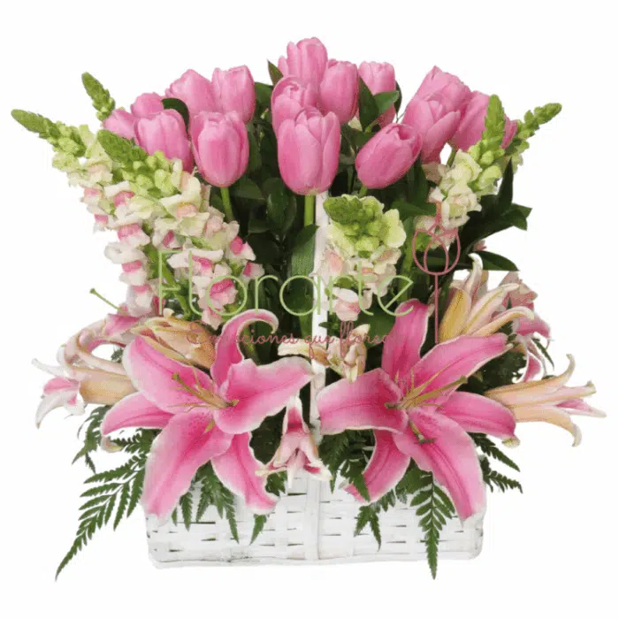 ¡Regala flores preciosas, porque se merece lo mejor del mundo esa gran persona! Preciosa canasta elaborada con una decena de Dragonarias en todo bicolor rosa con blanco, 2 decenas de Tulipanes rosas, 4 tallos de flor Oriental al pie de los tulipanes entre follaje de Leather en una preciosa canasta blanca cuadrada.