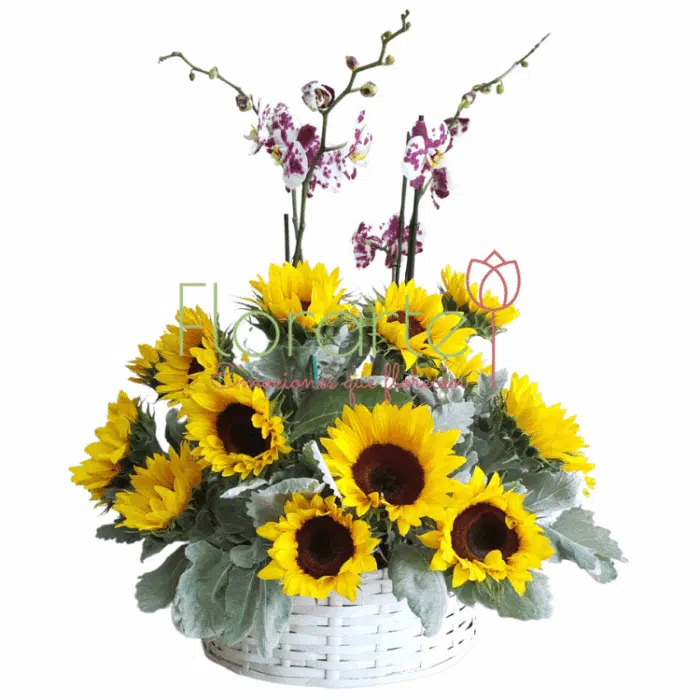 ¡Regala flores que con su color amarillo vibrante alegran cualquier momento u ocasión y su significado de felicidad, positivismo y alegría lo convierten en el arreglo ideal! Elegante canasta blanca con 20 Girasoles y al centro 2 Plantas de Orquìdeas Phalaenopsis de doble tallo cada una moteada en color blanco y morado con un toque de follaje de Miller.