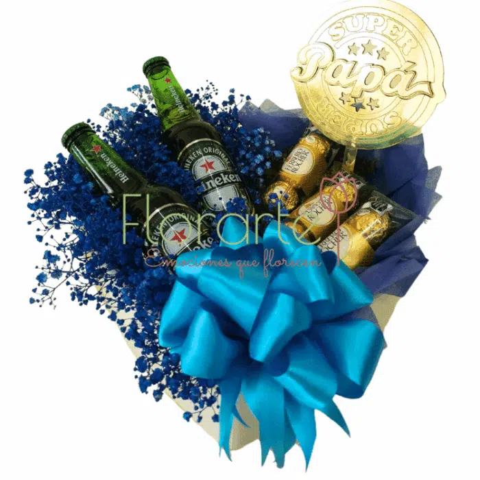 Convierte este día del padre, en un recuerdo eterno para él. Envia flores que con su magia le sorprenderá, arreglo elaborado con 2 Cervezas Heineken entre Baby azul pintado, 9 Chocolates Ferrero acompañados de 1 letrero de mdf en nuestra base de cerámica en forma de corazón con papel azul y un moño de tela.