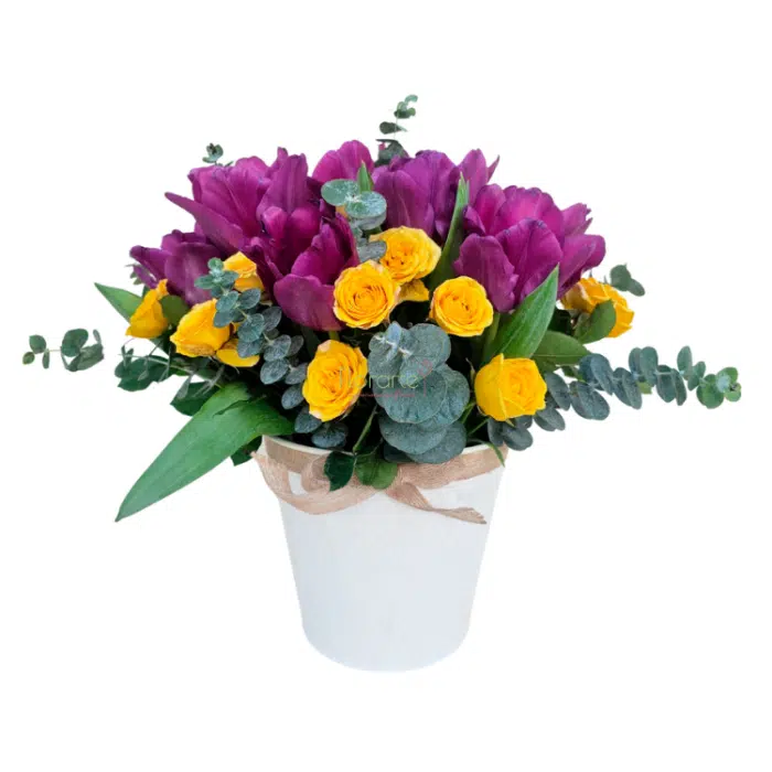 ¿Buscas un regalo práctico y espectacular para enviar flores a domciilio en San Valentín? Tenemos el mejor disñeo floral para ella, 10 Tulipanes morados entre Rosas Baby amarillas con Dólar en nuestra “Cubeta Consentida”. No esperes al último momento. Regala frescura y diseño este 14 de febrero.