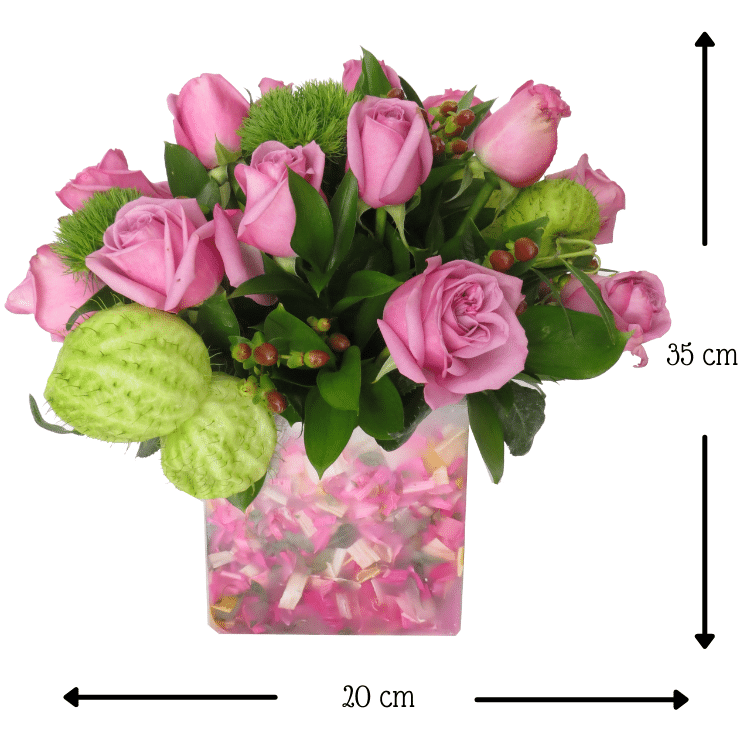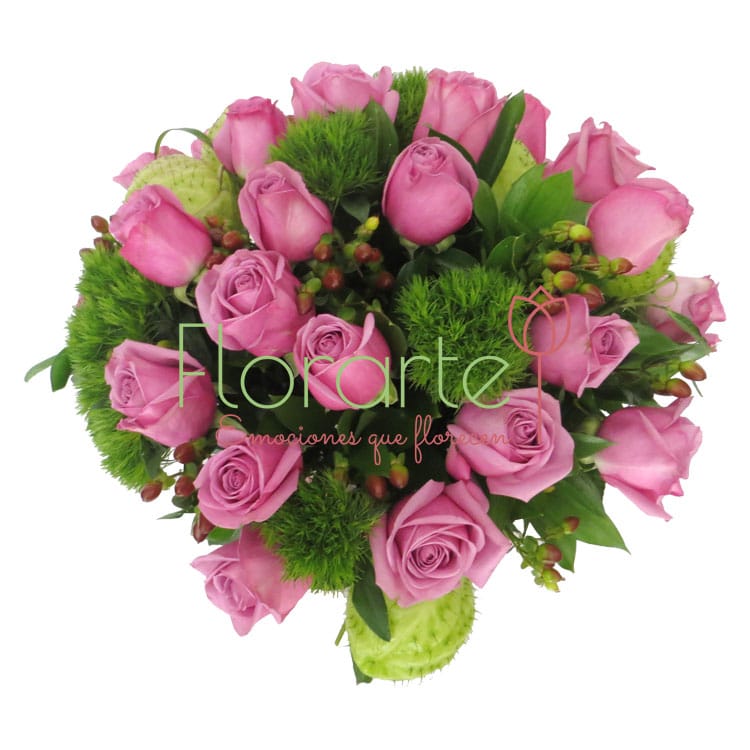 Más que sólo flores a domicilio, regala un lindo diseño floral elaborado con dos docenas de Rosas uva, una decena de tallos de Green, empéricos y bombis en nuestra base de cera Florencia.