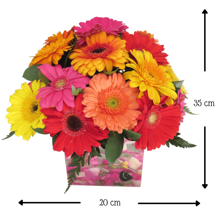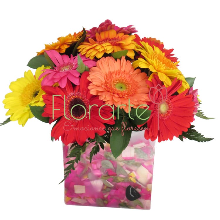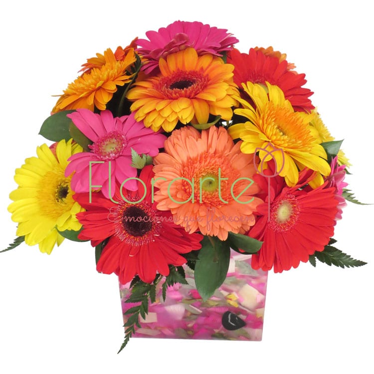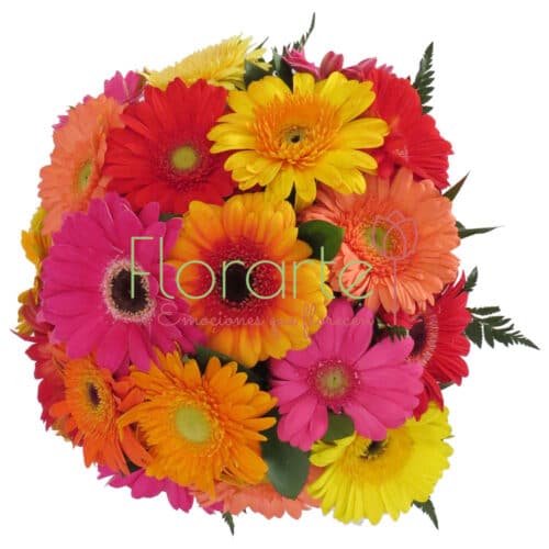 Envìa flores con este hermoso y alegre arreglo con dos decenas de Gerberas en tonos mixtos con follaje de Leader, en nuestra base de cera Florencia.