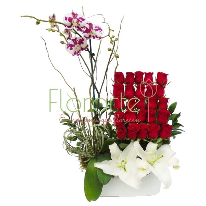 Sorpréndela con este elegante y hermoso arreglo con una Planta de Orquídea Phalaenopsis, dos docenas de Rosas rojas y flores de casablancas a sus píes, en una elegante jardinera de cerámica blanca de primera.