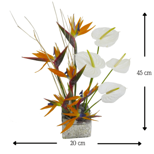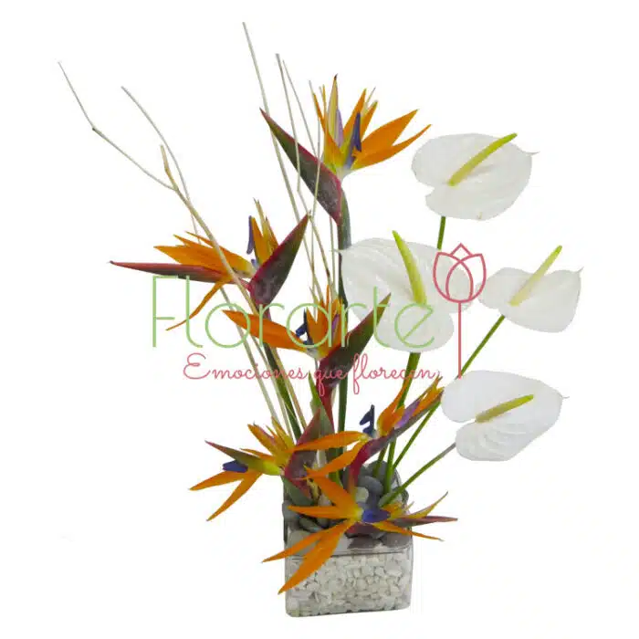 Elegante arreglo minimalista con Aves del Paraíso, 4 Anturios, varas de Madroños, en una base de vidrio fondeada con gravilla de marmol y piedras de río. Para el o ella si le gusta lo sencillo y elegante.