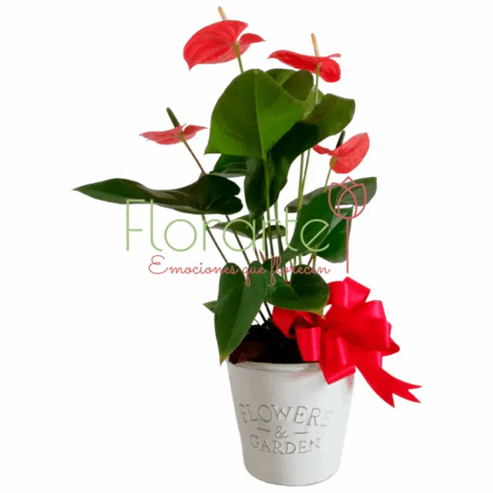 ¡Envía flores que no sólo van en el jardín, si no también en el corazón! Grandiosa Planta de Anturios rojos en nuestra elegante base de cerámica Flowers and Garden con un moño de tela rojo.