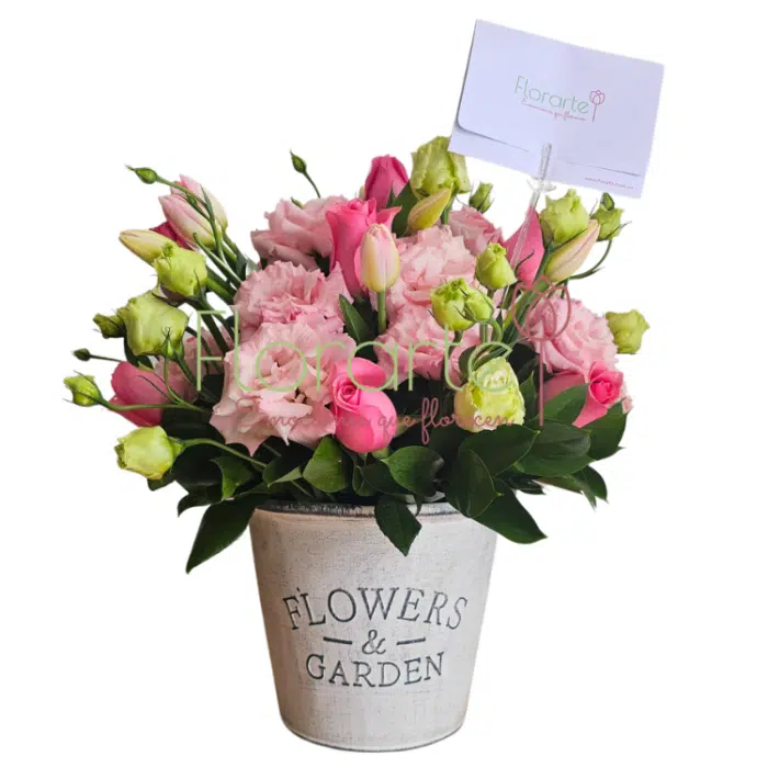 Excelente arreglo floral para enamorarla. Envía flores para consentirla llenas de cariño y ternura, elaborado con una decena de Tulipanes rosa, una docena de Rosa Caricia y una decena de tallos de Lisianthus rosa en nuestra base elegante de cerámica F&G.