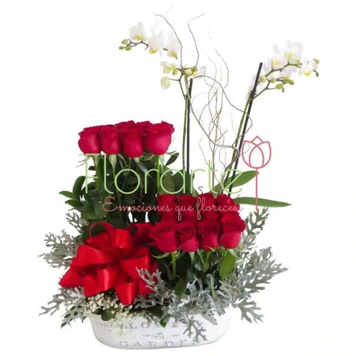 Hermosura de arreglo elaborado con dos docenas de rosas rojas, una planta de orquídea baby o mini de doble tallo entre follaje Miller (gris) y un lindo moño de tela en rojo en nuestra base de cerámica Flowers & Garden.