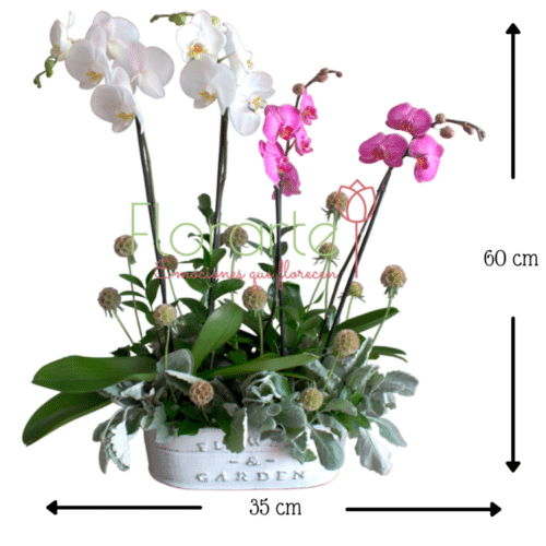 Envía flores dellas y duraderas que recuerde toda la vida. Elegante arreglo elaborado con 2 Plantas de Orquídeas Phalaenopsis de doble tallo cada una en color blanco y rosa entre follaje de Miller y Escabiosas en nuestra jardinera de cerámica de F&G.