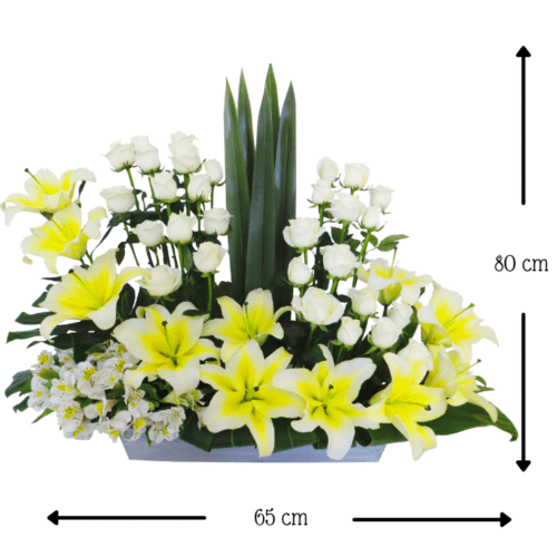 Envía tus condolencias con este abundante arreglo fúnebre, diseño elaborado con 28 Rosas, una decena de Alstromelias con follaje de Fornios al centro y hojas de piñanona en una base jardinera de madera (mdf).