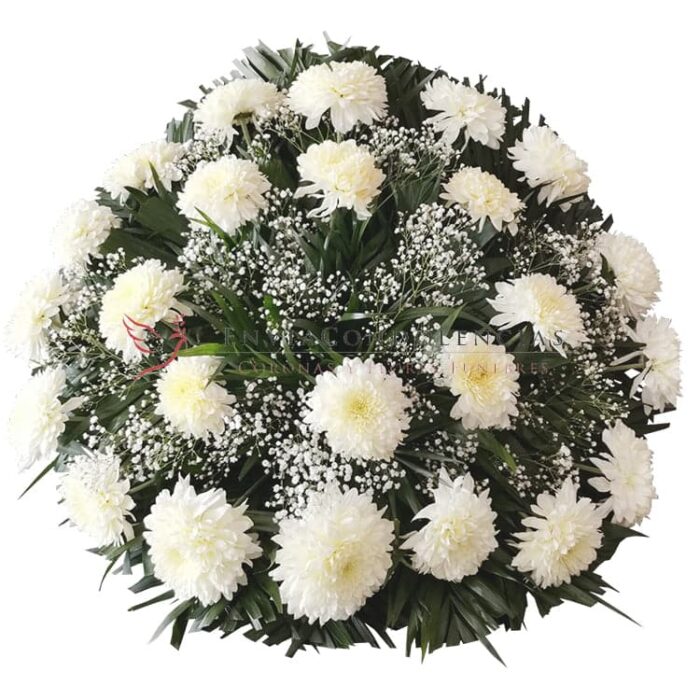Envía flores de condolencias que te permiten acompañar a la familia, confortarla en un momento tan difícil. Dos decenas de flores de Polar, y flor de velo o Baby, con follaje de camedor Jumbo.