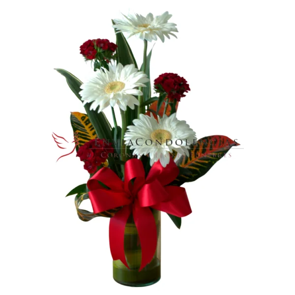 Regala flores sencillas y bellas que consuelen el alma, arreglo floral elaborado con 3 Gerberas en color blanco, con Hortensia verde entre hojas de Croto en un cilindro de vidrio acompañado de un moño rojo.