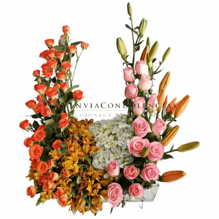 Precioso arreglo floral para honrar entre flores las cenizas de tu ser querido, arreglo elaborado con 16 Rosas de invernadero en color rosa entre flores de Lilis naranjas, Hortensias azuladas, Alstromelia amarilla y Rosa baby naranja. Al centro se colocan las cenizas.