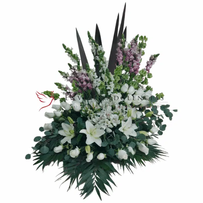 Envía un abrazo de paz y consuelo con este hermoso arreglo fúnebre elaborado con 2 docenas de Rosas de invernadero blancas, flores de Casablancas, Alstromelias blancas, una decena de Dragonarias blancas y una decena más en color rosa entre follajes de Fornios, Molucella, jumbo y Dolar Papalo.