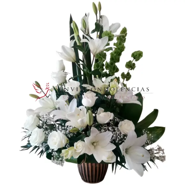 Flores para abrazar el alma con este bello arreglo, envía tus condolencias con una docena de rosas blancas, media decena de flor de Casablancas, flor de velo, entre dracenas, fornios y campanilla en una base vintage.
