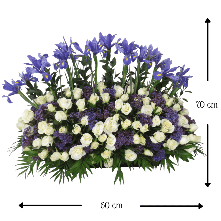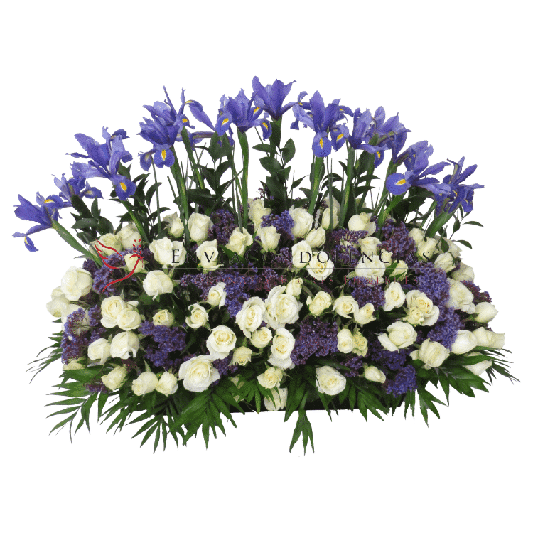 Envía tu pésame con éste abundante arreglo fúnebre elaborado con 4 docenas de Rosas blancas de invernadero, 20 tallos de Iris morados entre flor de Espuma morada con follajes de Ruscus y Jumbo en una base de madera (mdf).