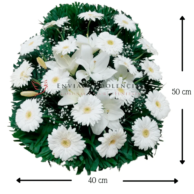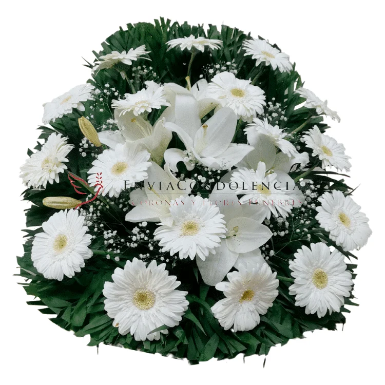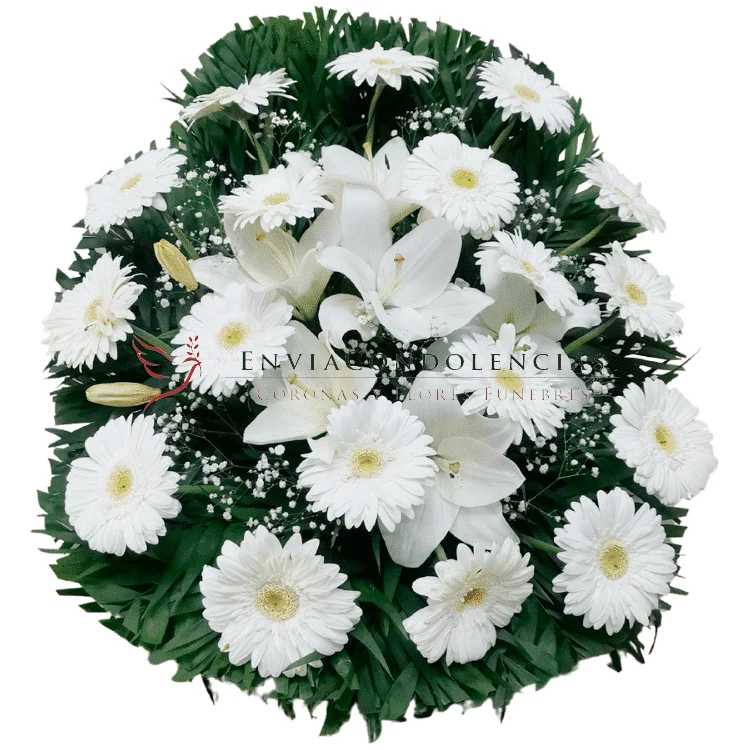 Brinda tu solidaridad y condolencias con este generoso arreglo. Envía flores fúnebres con este hermoso arreglo elaborado con hermosas flores de Gerberas blancas de 18 a 20 flores dependiendo su tamaño y al centro flores de Lilis blancas con un toque de Flor de Velo.