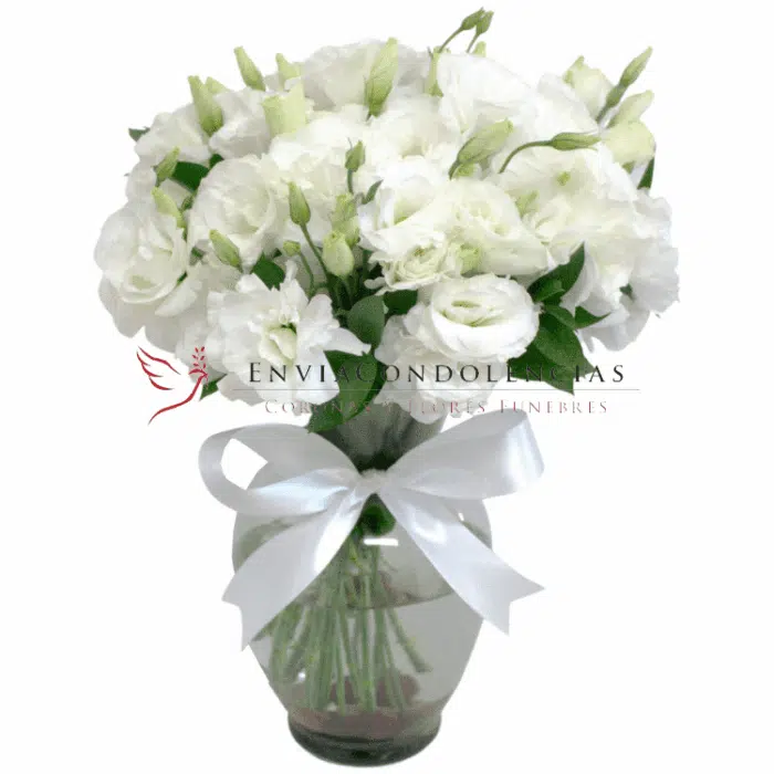 Las últimas flores a un ser querido son para siempre, envialas elegantes y hermosas. Arreglo fúnebre elaborado con flores de Lisianthus en un florero de vidrio y al fondo piedras de rio.
