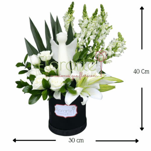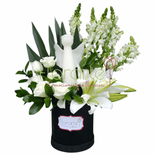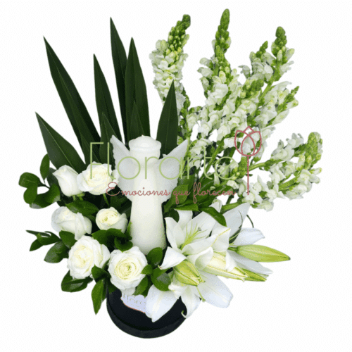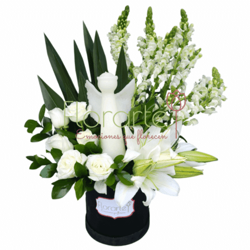 Ofrece un tributo floral lleno de respeto y serenidad. Envía Flores de Condolencias con esté bello diseño floral elaborado con 6 Rosas Blancas de invernadero, 3 Tallos de Casablancas, 5 tallos de Dragonarias blancas, 1 vela en forma de Ángel en el centro entre follajes de Ruscus y Fornios en nuestra elegante base de cilindro de mdf negra.