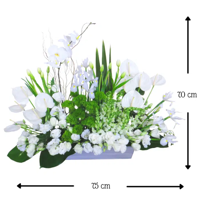 Honra el haberle conocido en esta vida con hermosas flores en su despedida. Envía tu pésame con estas arreglo de flores fúnebres elaborado con 1 decena de Tulipanes, 1 decena de Anturios, 1 decena de flores de Green, 1 decena de tallos de Dragonarias, 1 decena de tallos de flores de Lisianthus, 1 decena de Iris Casablanca y un bello tallo de Orquídea Phalaenopsis con más de 6 flores abiertas más botones, con follajes de Fornio en una jardinera blanco y gris.