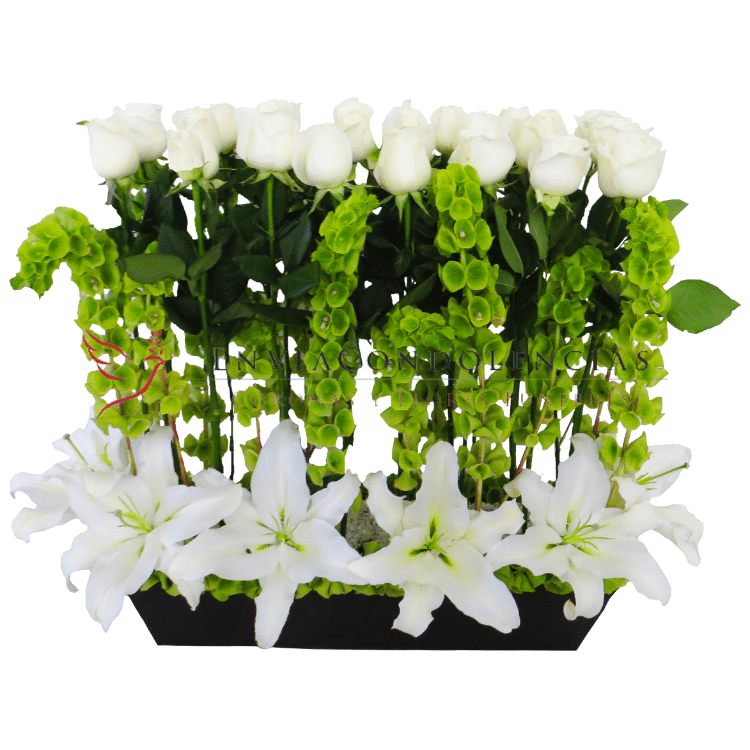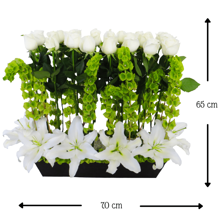 $5,750.00Sólo hay una manera de despedir a una gran ser humano con quien compartimos la vida o parte de ella. Envía este bello arreglo fúnebre realizado con 1 decena de Tulipanes, 1 decena de Anturios, 1 decena de Iris casablanca, 1 decena de flores de Drágón, 1 decena de tallos de flor Green, 2 decena de tallos de Lisianthus (unos en morado y otros en blanco) y un hermoso tallo de Orquídea Phanelopsis, entre follaje de molucellas, Curli Wilow, hojas de piñanona, hojas de Anturium, en una base de madera pintada en blanco y gris en barrido.