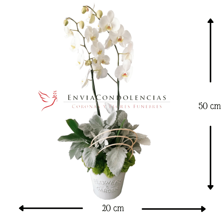 ¡Envía flores duraderas llenas de luz y eternidad! Elegante Orquídea Phalaenopsis doble tallo en color blanca acompañada de finos follajes de Green y Miller un nuestra base de cerámica Flowers and Garden.