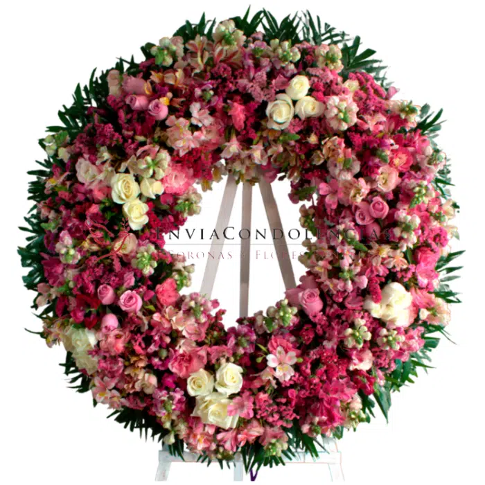 Envía tus condolencias a domicilio con esta hermosa corona digna de la última despedida: 15 Rosas blancas, Alstromelias en color rosa, 15 rosas hermosa, Lisianthus rosa, Statis rosa y flor de Dragonaria.