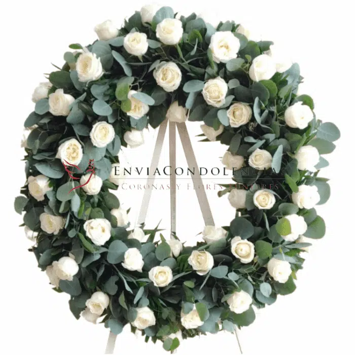 Envia flores que son un homenaje, bella corona para esa persona que ha partido. Corona fúnebre elaborada con 6 docenas de rosas de invernadero blancas entre follaje de dólar papalo.