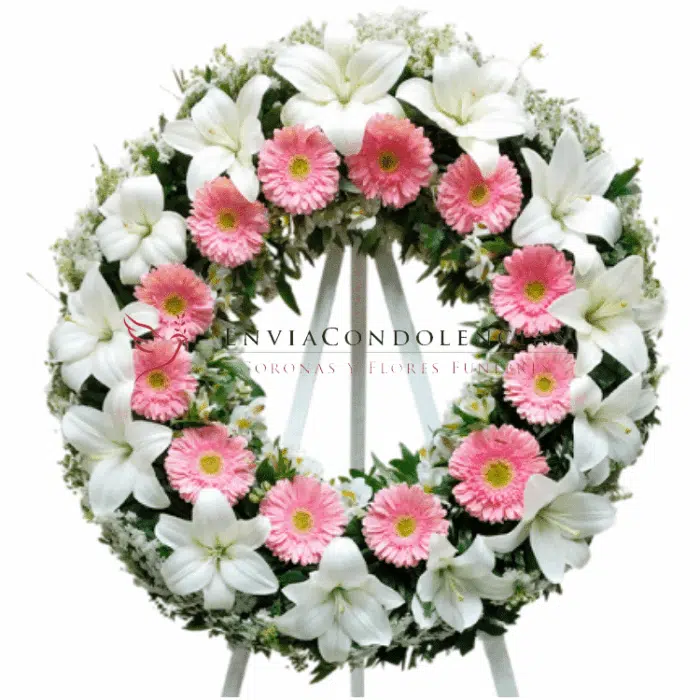 Envía flores fúnebres elegantes y dignas de la última despedida. Preciosa corona elaborada con una docena de Gerberas color rosa, flores de Casablancas, Alstromelia y flor de Velo.