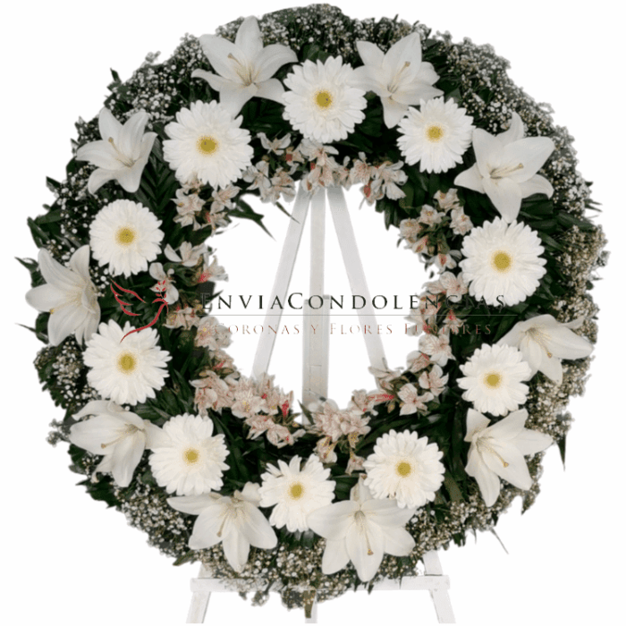 Envía tus condolencias con esta hermosa corona fúnebre que abraza el alma. Corona elaborada con una decena de flores de Gerbera, Alstromelias y flor de Velo, presentada con elegancia y seguridad en su base de tripíe que no se recarga contra muro respetando los lineamientos de las funerarias.