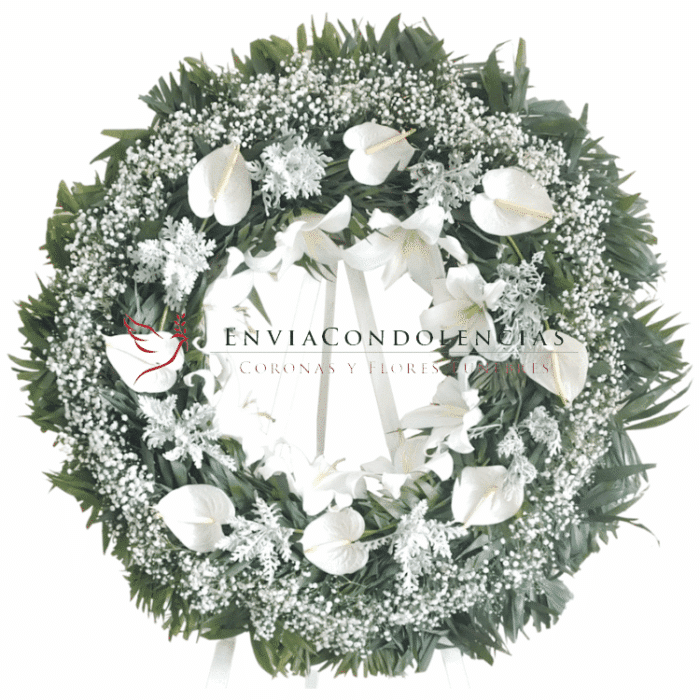 Aunque hayan partido nuestros seres queridos nos dejan un eterno recuerdo. Envía tus flores de condolencias con esta hermosa Corona fúnebre elaborada con: 8 flores de Anturios blancos entre un toque de Dustyn Miller, una circunferencia de flor de Velo y una más de flores de Casablancas aromaticas.