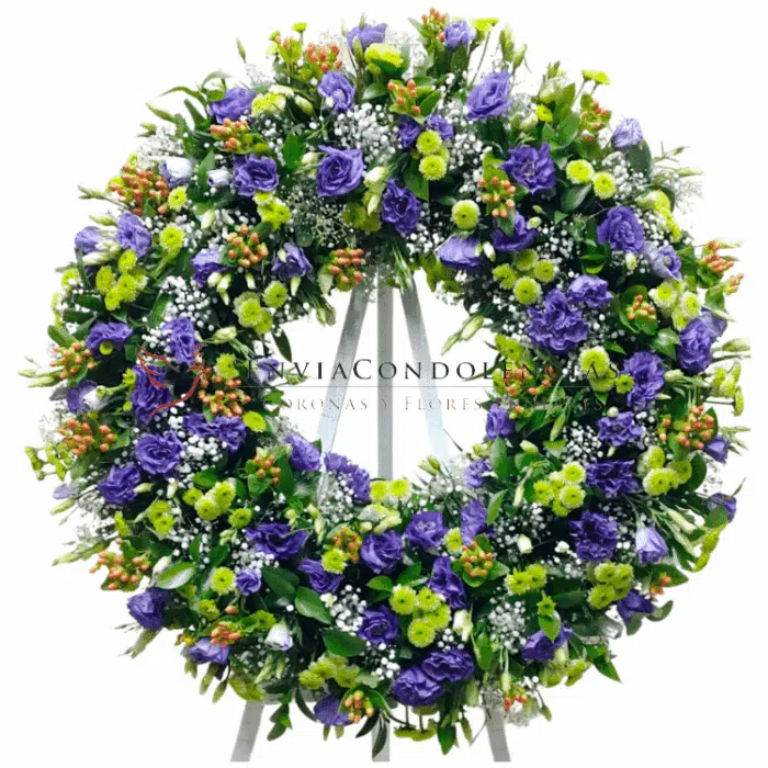 Hermosa corona para despedirle y desearle un buen camino. Corona fúnebre elaborada con flor de Lisianthus morado, Empericum, Yoko, flor de Velo o Encaje entre follaje de Ruscus y follaje de Jumbo.