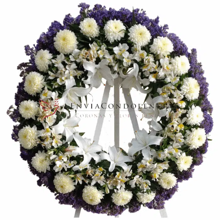 La pérdida de un ser querido es un dolor que nos llega al alma; despedirse con hermosas flores es un homenaje a su vida. Preciosa corona fúnebre elaborada con flor de Stati morado en toda la circunferencia, flor de Polares, Alstromelias y Casablancas entre follaje de Jumbo.