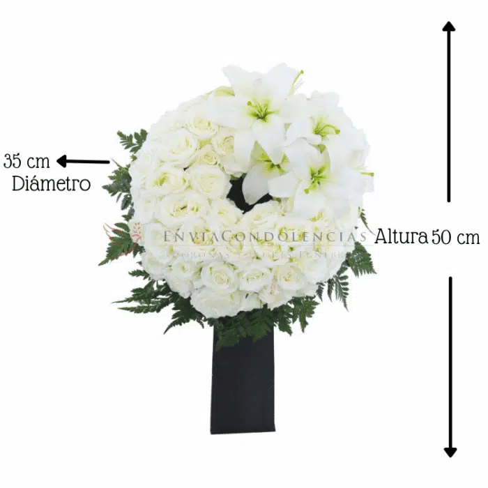 Las flores guían el camino de los que ya no estarán con nosotros. Envía tus condolencias con esta bella corona elaborada con seis docenas de Rosas blancas y un tocado de Lilis blancas con follaje de helecho Leader en todo el contorno, se entrega montada en su pedestal de madera.