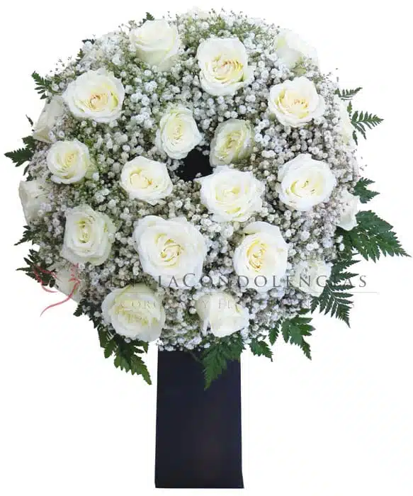 Envía tu cariño y solidaridad con esta hermosa Corona funeraria elaborada con flor de Velo y posada sobre ella 2 docenas de Rosas de invernadero en tono blanco montada en su elegante pedestal de madera.