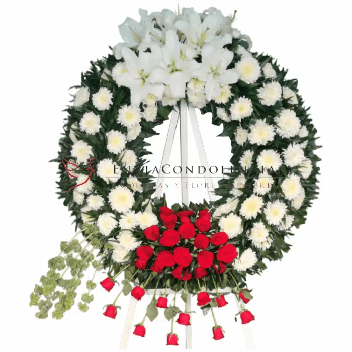Mirar por última vez a ese ser querido que partió, es una mirada que no se olvida, que nos lleva en segundos del día en que le conocimos al día de hoy. Despídele con flores intensas. Corona funeraria elaborada con Rosas Rojas, Polares Blancos y flores de ároma de Casablanca entre follaje Ruscus y Campanas Irlandesas.
