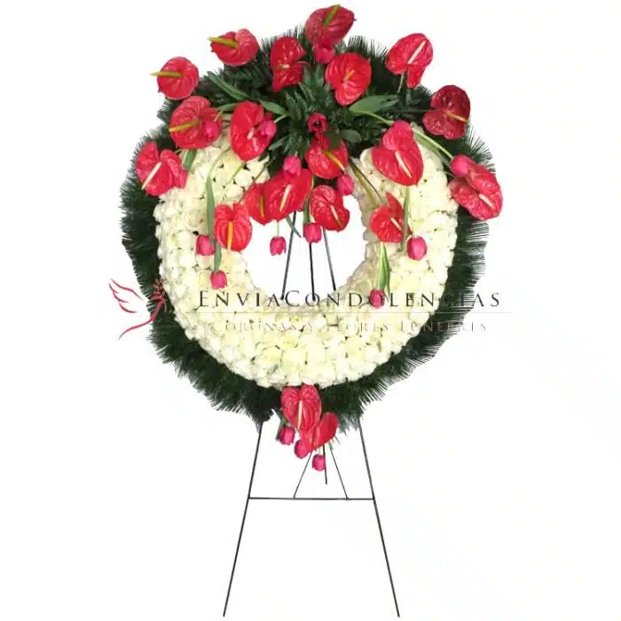 Envía flores de condolencias que reflejan el de amor que en vida y hasta siempre le tendrás a ese ser amado que partió hacia la luz. Preciosa y elegante corona fúnebre elaborada con 12 docenas de Rosas blancas, dos decenas de bellos Tulipanes rojos, dos decenas de finos Anturios Rojos. Follaje de Camedor jumbo en la circunferencia.