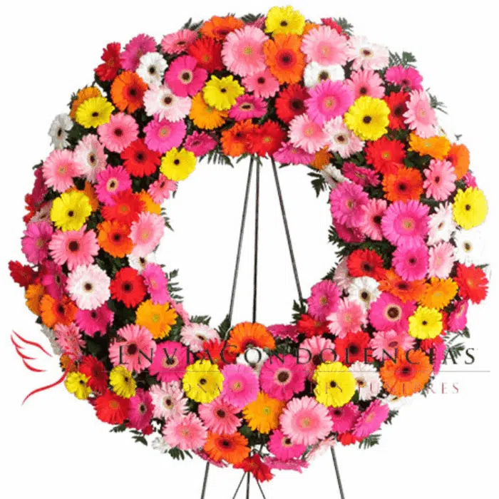 Hay personas que transmiten alegría, su vitalidad y felicidad están a flor de piel, nada más bello que despedirles en su último adiós con esta hermosa y colorida corona de flores de Gerbera, solicítala ahora.