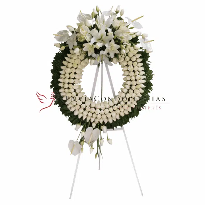 $3,750.00El precio original era: $3,750.00.$3,500.00El precio actual es: $3,500.00.En momento doloroso puede ser oscuro, pero siempre hay una luz hecha de buenos recuerdos que como flores blancas y resplandecientes nos iluminan y acompañan. Envía tus condolencias con esta corona funeraria elaborada con 12 docenas de rosas (144 pzas.) un medallón de flores aromáticas de Casablanca y una docena de Gerberas blancas, el diámetro lo marcan helechos Leader, Clavo Japones y Moluccella.