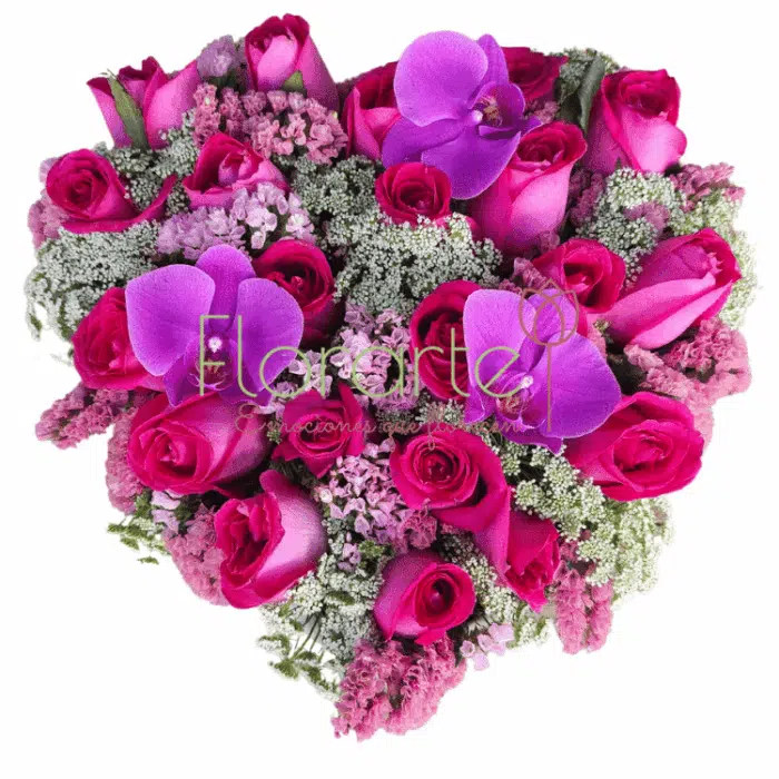 ¡Un corazón que late al ritmo del amor! Este corazón floral es mucho más que un simple arreglo; es una expresión de tus sentimientos más profundos. Las orquídeas Phalaenopsis, reinas de la elegancia, se entrelazan con rosas fucsias, Estati y Encaje, creando una composición única y sofisticada. ¡Sorprende a esa persona especial con un regalo que tocará su corazón!