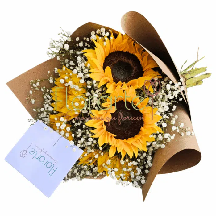 Su vibrante color evoca la luz del sol, llenando de vida cualquier espacio. Regala flores a domicilio con un mensaje de positividad y sofisticación, elaborado con 5 Girasoles entre flor de Baby con papel Kraft y un moño de tela para adornarle.